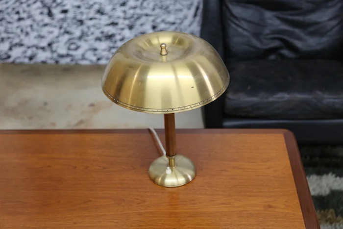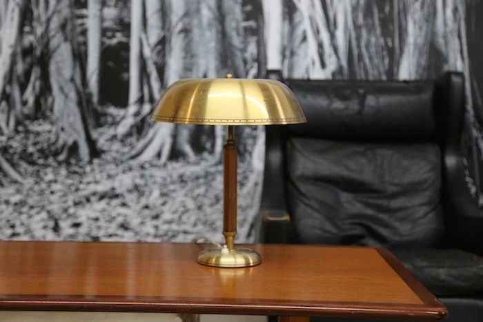 Brass table lamp with a faceted teak wooden base. Original European plug. Probably from the 40s, classic umbrella design. The lamp is functional. Minor stains on metal shade, minor scratches on wooden base.