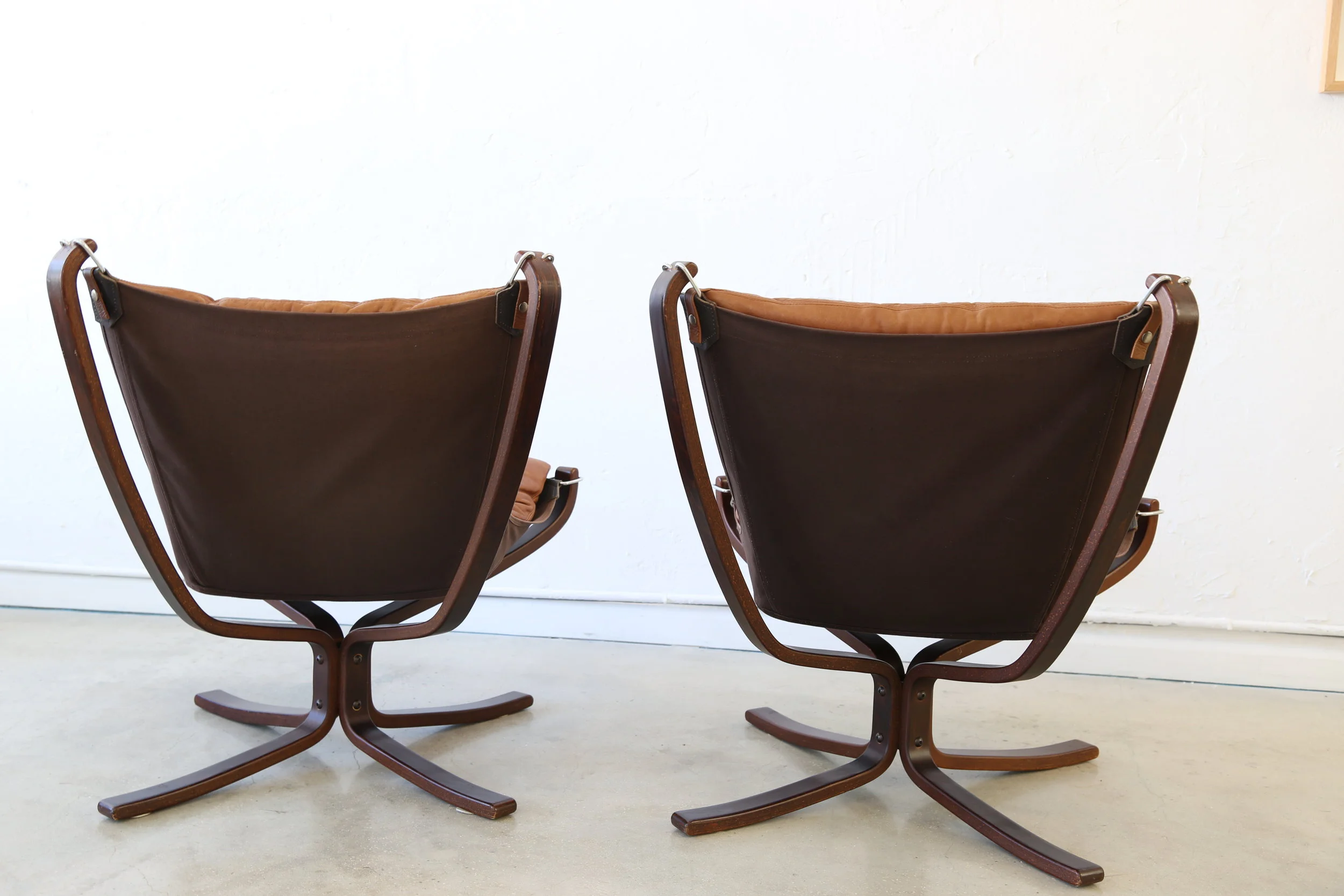 This is a timeless pair of modern Falcon chairs by Norwegian designer Sigurd Ressell for Norwegian furniture company Vatne Møbler. They are very comfortable, with lumbar support in a hammock-like design. Collectible and an easy addition to any interior design setting, as seen in the Architectural Digest feature of Liev Schreiber and Naomi Watt's New York Apartment. The cognac color leather is a beautiful contrast against the darker wood. Wooden legs are in excellent condition. Seat height is 17 inches.