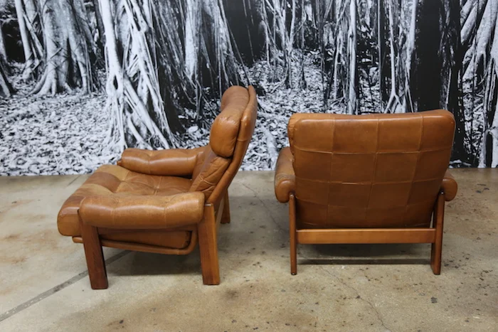 The comfort of a leather chair without the bulkiness of a leather chair. Made by Göte Möbler (G Mobler) this "Carmen" easy chair pair is in great vintage condition. Light patina on the leather, most noticeable on the armrests as seen in pictures. Cushions are removable from chair with zipper opening for easy cleaning. Wooden legs are beautifully craved and stained, with minor nicks, barely noticeable. Signage is on a little metalic plate on each chair. Very comfortable and sturdy. Seat height: 18 inches. Color is caramel.