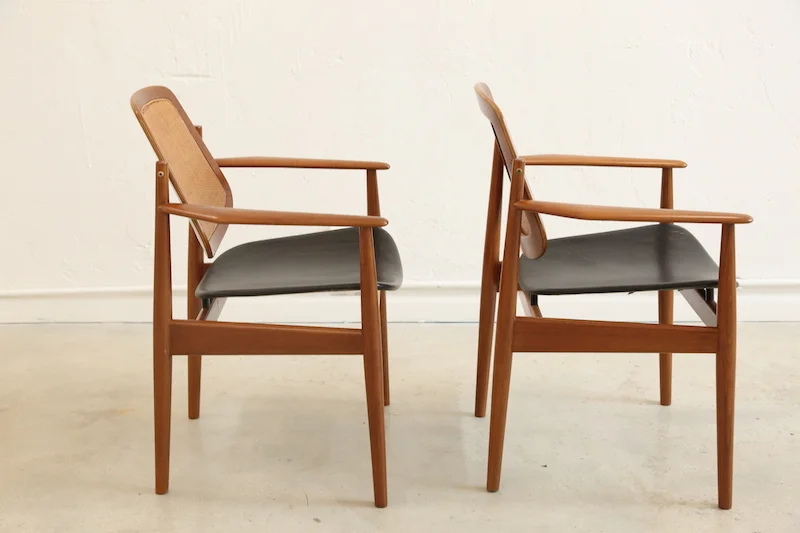 Produced by France & Son in Denmark, these Arne Vodder designed armchairs are in excellent condition, chairs and cane backing have been refurbished and are as new, original leather seats have light patina on them. Both chairs have their marks from France & Søn and from Illums Bolighus, the department store in Copenhagen from which they were purchased in the 60s. Acquired directly from the original buyer's home who owned them for over 45 years. Extremely comfortable, the backs of these chairs sway on a brass hinge which is original and in excellent condition. A collectible pair and great addition to any dining set or sitting corner. Seat height is 17 inches and armrest height is 25 inches.