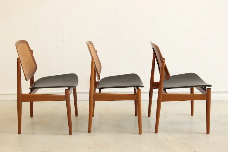 Produced by France & Søn in Denmark, these Arne Vodder designed dining chairs are in excellent condition, chairs and cane backing have been refurbished and are as new, original leather seats have light patina on them. All 3 chairs have their marks from France & Søn and from Illums Bolighus, the department store in Copenhagen from which they were purchased in the 60s. Acquired directly from the original buyer's home who owned them for over 45 years. Extremely comfortable, the backs of these chairs sway on a brass hinge which is original and in excellent condition. A collectible pair and great addition to any dining set or sitting corner. Seat height is 17 inches.