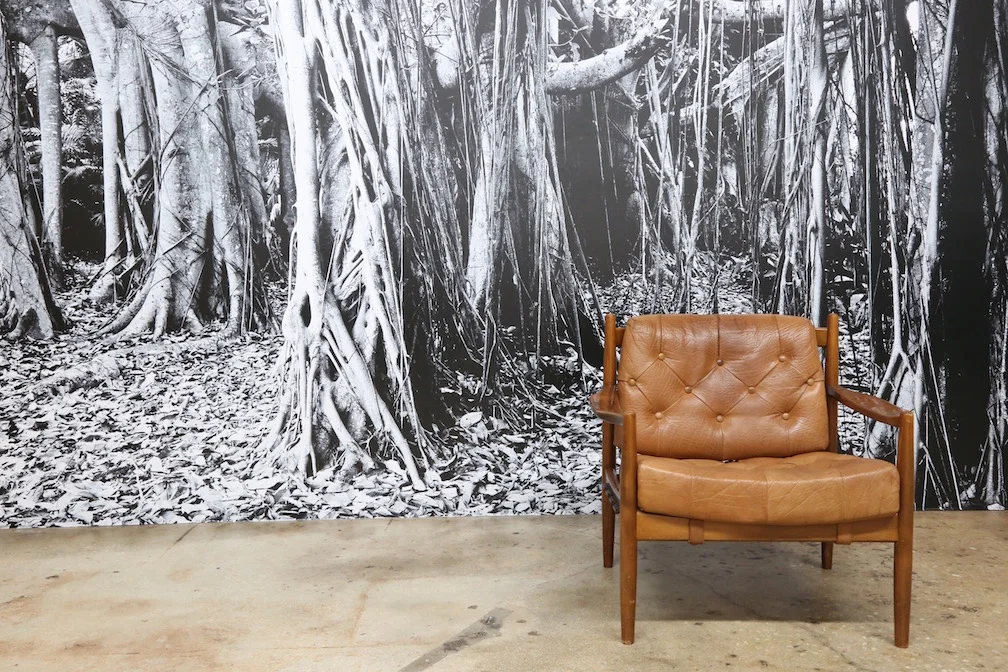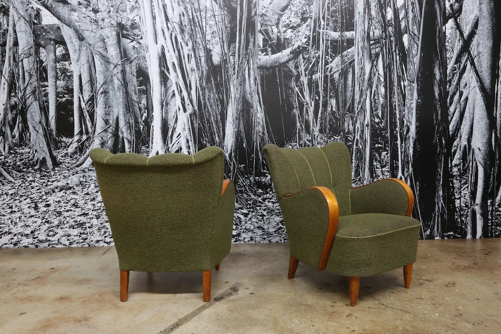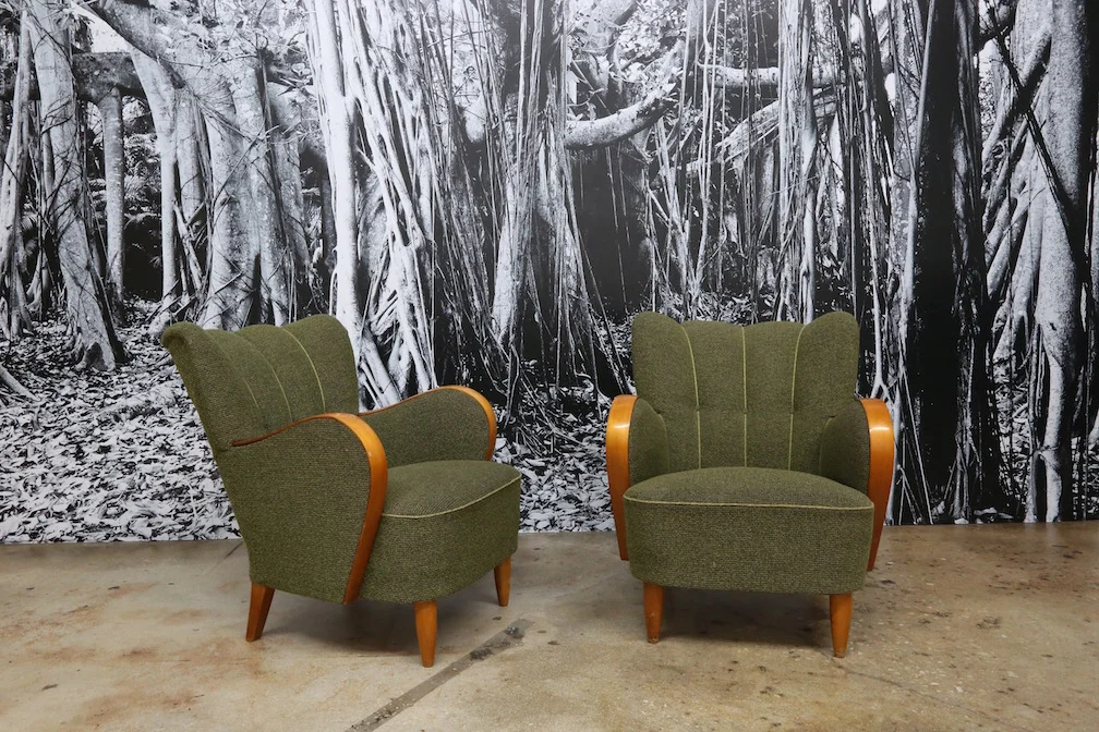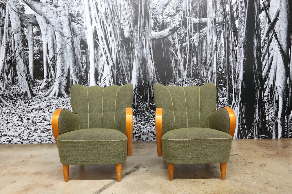 Art Deco club chairs with a shell/fan back motif and bentwood armrests.