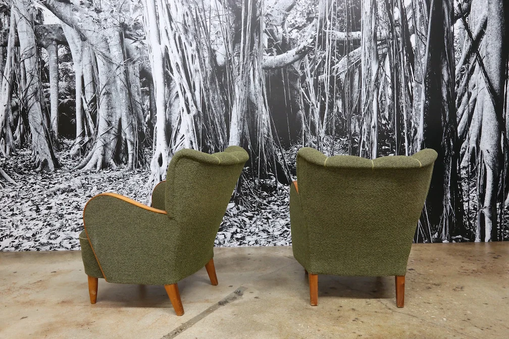 Reupholstered Scandinavian wingback chair in olive green velvet fabric. A 1940s look with a contemporary touch in 2017's Pantone color of the year greenery. It's a comfortable lounger for reading with great head support and curved upward arm rests. It's an understated statement chair, that glam touch to any room. Seat height 18 inches.