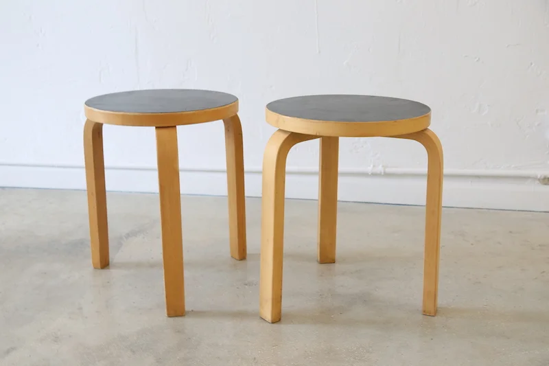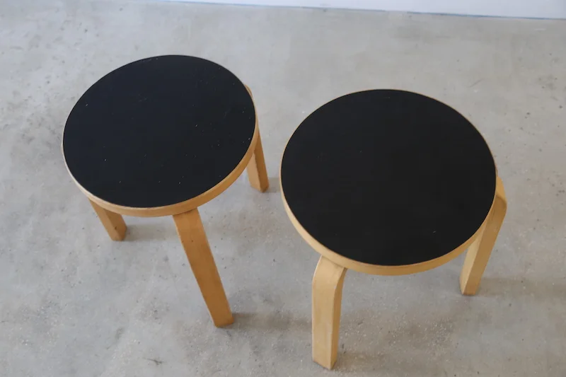 This pre-loved pair of black Alvar Aalto stools are a classic addition to any room. The Stool 60 was designed in 1933 by Finnish designer Alvar Aalto, who is considered as one of the founding fathers of modern design. The bentwood solution of the Stool 60's L shaped leg is popular among all of Aalto's pieces. Not only was Aalto concerned with formal design concerns but also in the spirit of beautiful materials and the simple forms of modernism. Aalto was a fan of artists such as Jean Arp and Brancusi. These stools are in lovely used condition, the black laminate is in great condition, one of them has minuscule white speckles on it. Great as additional seating, or side tables they can be kept in any corner stacked and ready to use. Not sure the year in which these were produced. Obtained directly in Helsinki from Artek 2nd cycle in Finland.