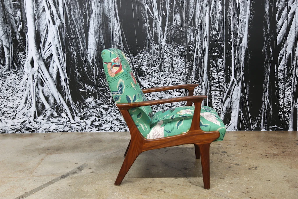 This Carl Malmsten style chair was a design for NK Stockholm and is a Swedish classic lounge design with slightly winged arms, no signage on the chair. It has been reupholstered in a reedit of Josef Frank’s Exotic Butterfly design, Schumacher 1898 designer fabric. Seat Height: 16 Inches