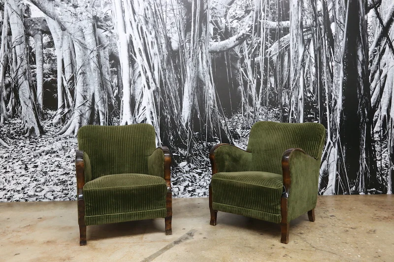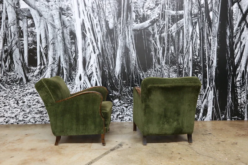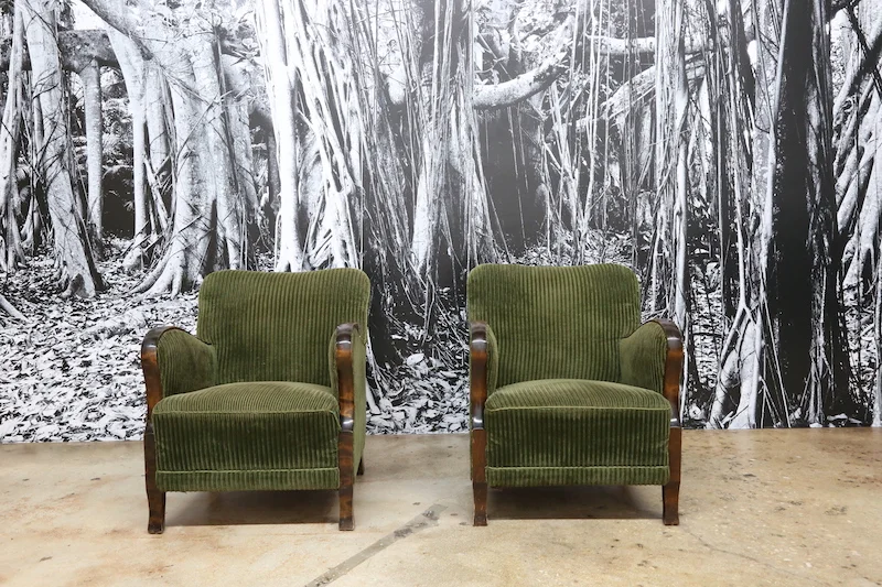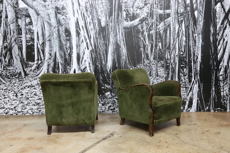Beautiful green corduroy club chairs circa 1930s made in Sweden. Size is perfect for sitting area, small apartment, library or office. Cozy dark wood with a nice patina on armrests and legs. Upholstery is in good condition but perfect for a custom project.