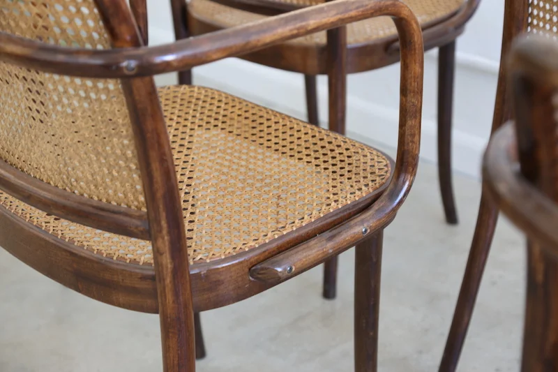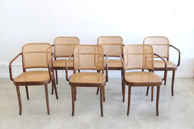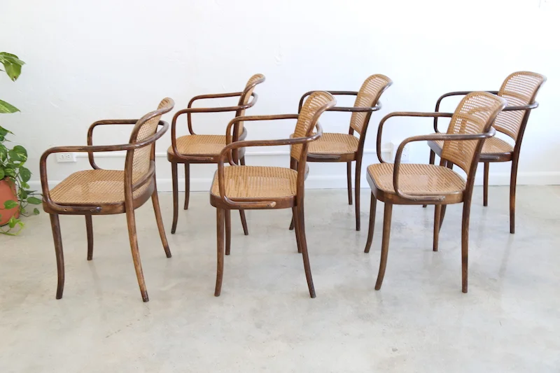 This set is fantastic, not only because the cane is in perfect condition but also they are a true classic for any home wanting a vintage touch. The design is originally the 811 dining chair by Josef Hoffmann who designed them for Thonet, a 150 year old company. The history of the Thonet manufacturing company involves family wars and several countries, these chairs form part of that history. These are all stamped Made in Poland and most of them have the FMG original paper label on them, some of them have additional codes on the paper labels and some chairs have numbers engraved in the bottom of the chair. Most likely they were produced in the 60s but I cannot verify that. What I can tell you is they have been loved and the wood has an aged patina on them and the cane is in excellent condition. Set of 6, seat height is 18 inches.