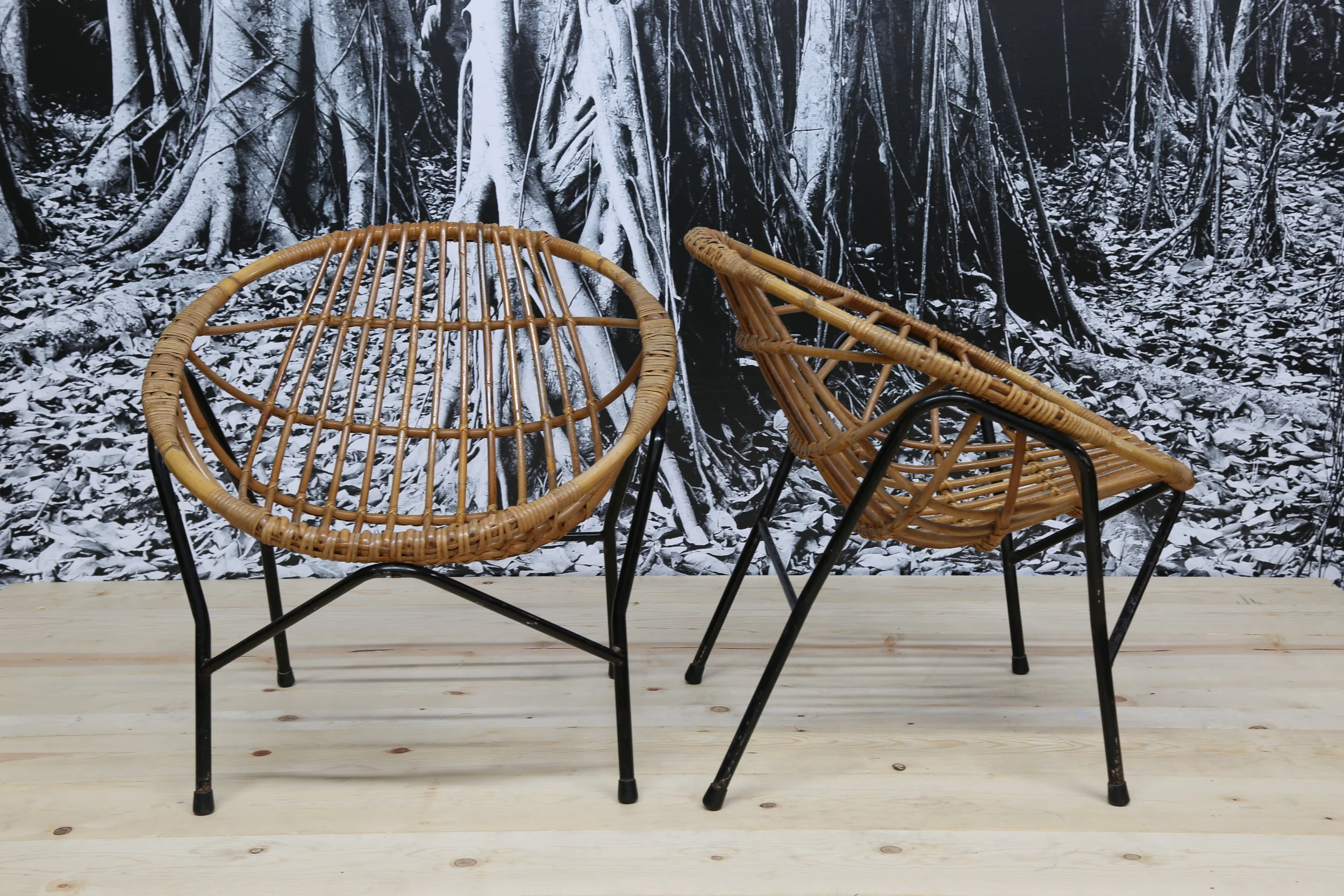 Wicker rattan and bamboo pair of clam lounge chairs in excellent condition. Mid-century design, designer unknown. Metal frame has a nice patina on it. A unique pair and a great addition to any living space, perfect for a sheep skin or Mexican throw blanket. Seat height is 15 inches. The label makes out to read Noordwolde, Holland. Rohe Noorwolde is a company in a village of Noorwolde in the Netherlands well know for its wicker production. Seat height is 15 inches.