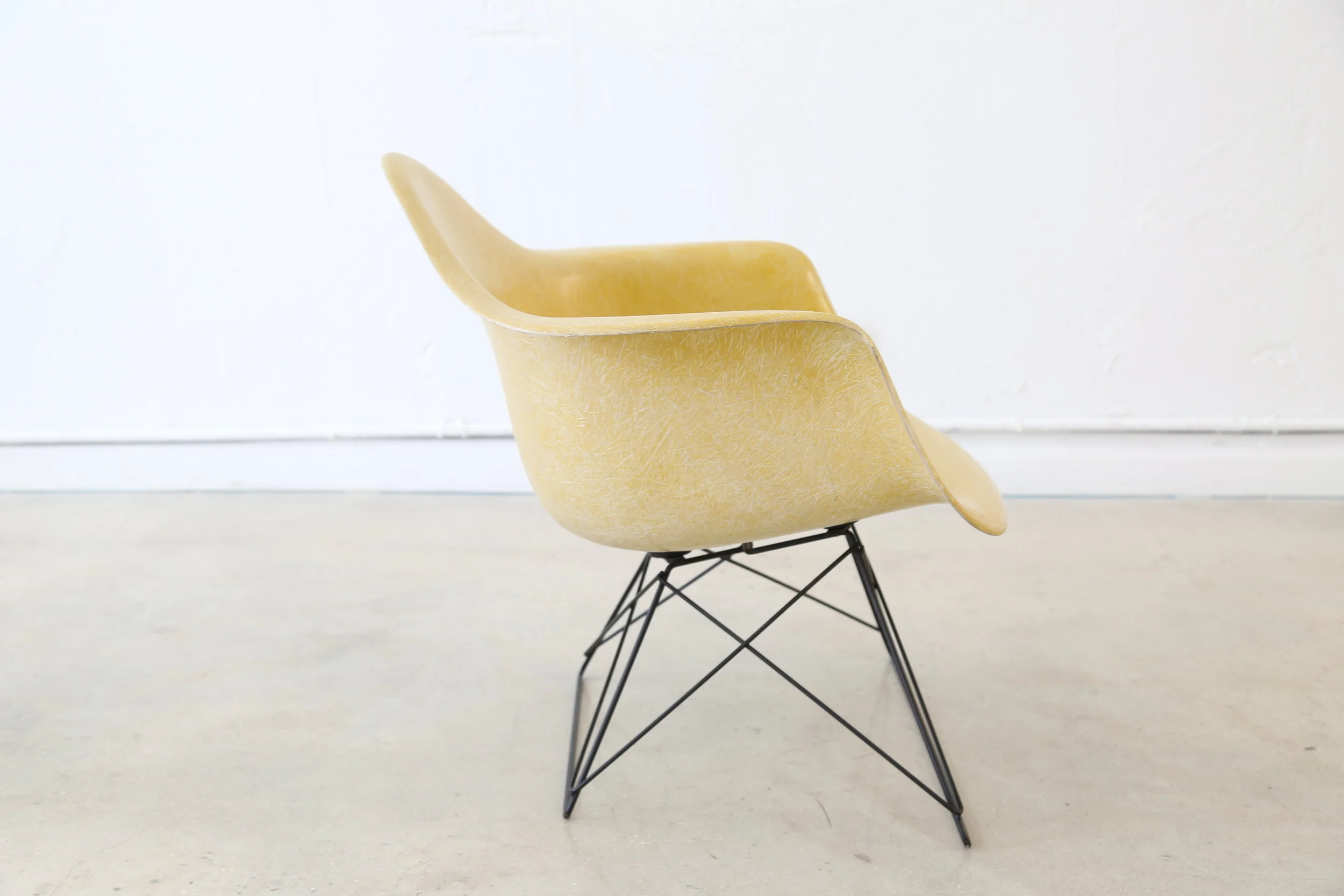 This original Eames Chair is called the LAR (Lounge Arm Rod) Armchair and is part of the low living lifestyle series of furniture pieces that were produced by Herman Miller. Designed in 1949 by Charles and Ray Eames, the cat cradle base is made of zinc plated steel and the shell seat is made out of fiberglass. A historic piece no longer produced by Herman Miller. The yellow color is in a beautiful vintage tone. Seat height is 12 inches.