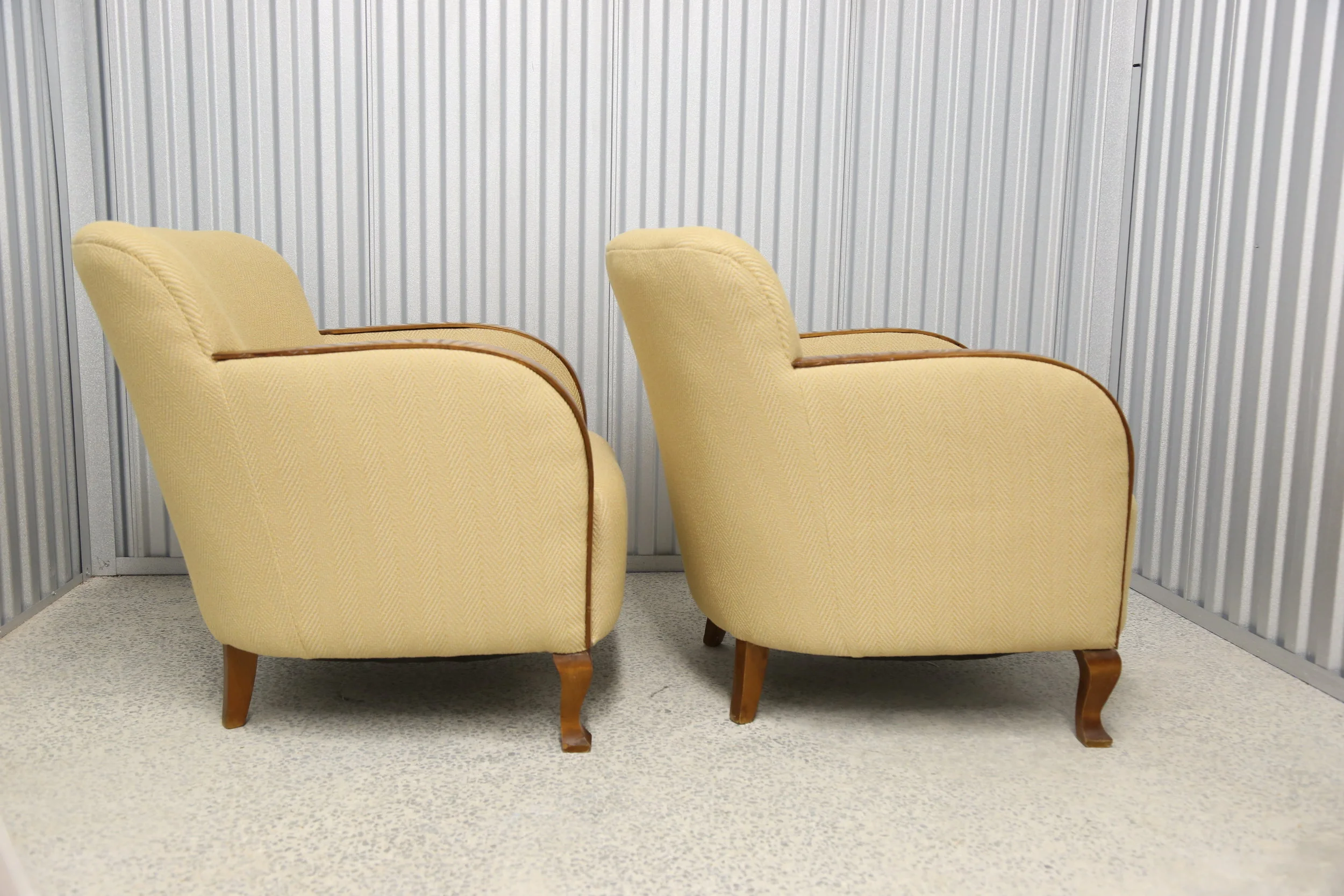 A beautiful example of Swedish Art Deco, a pair of club chairs that have been reupholstered in champagne microsuede. Wooden arms and legs are in good condition, consistent with age and use. Great for small apartments, chairs are small in proportion, very comfortable. Springs in great condition, original. Seat Height: 14.5 inches