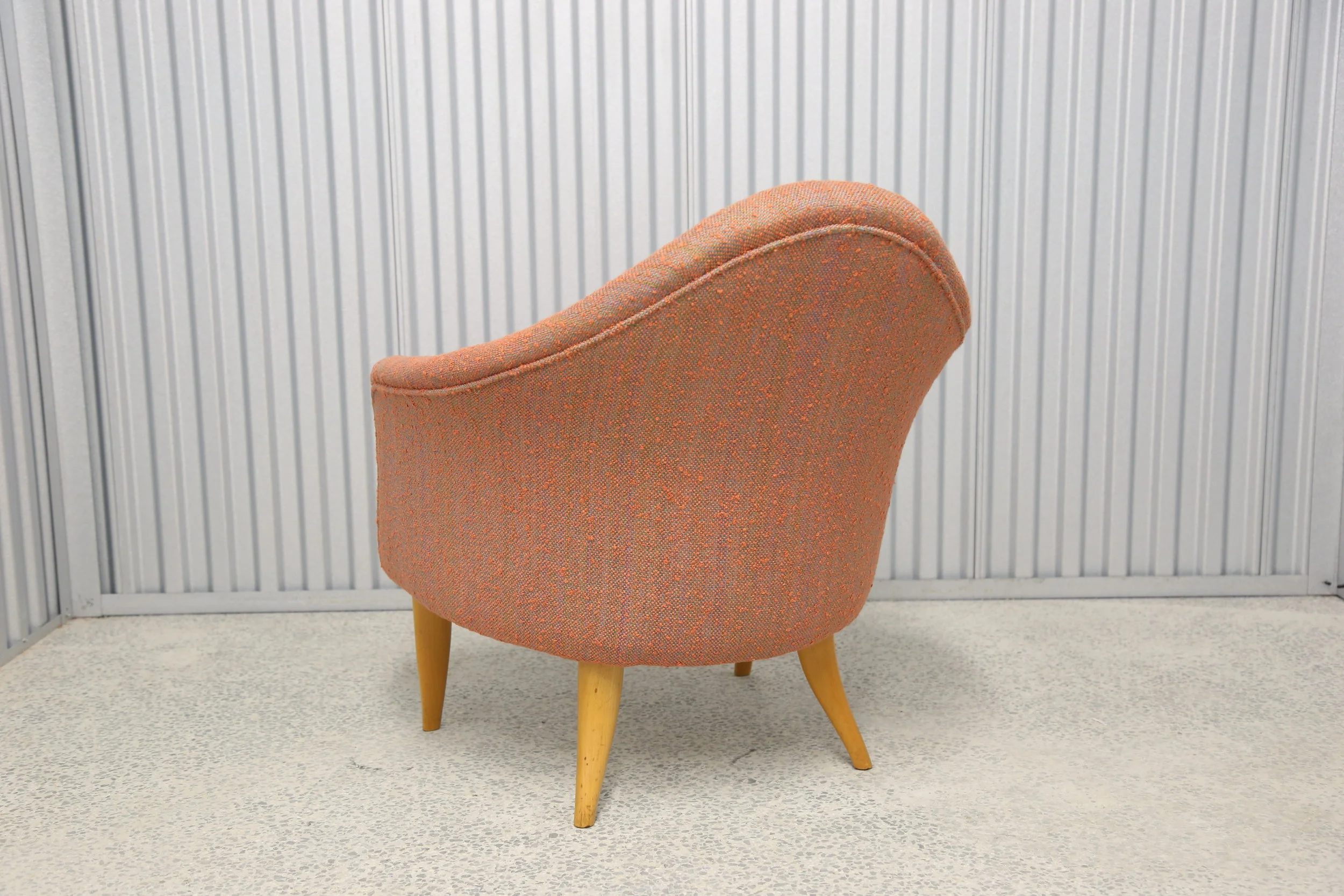 Kerstin Hörlin-Holmquist, Little Adam Lounge for Nordiska Kompaniet, 1958, Paradiset series, Triva Collection. Newly reupholstered in off-white herringbone fabric. The Paradise collection was a mid-century hit when it came on the market for a younger audience looking to purchase furniture with a more contemporary feel at the time. A very unique piece by a female designer from Sweden inspired in the Garden of Eden. The Paradise collection is a Scandinavian Modern design that reflects a transition from traditional to modern for the mid-century home. Newly upholstered in multicolored fabric with salmon overtone blue and green undertone with texture. Minor nicks on wooden legs, Original metal label reattached under chair post upholstery.